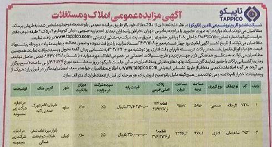 شرکت نفت و گاز و پتروشیمی تأمین (تاپیکو) در نظر دارد تعدادی از املاک مازاد خود را از طریق مزایده عمومی با وضعیت موجود و مشخص شده به فروش برساند.